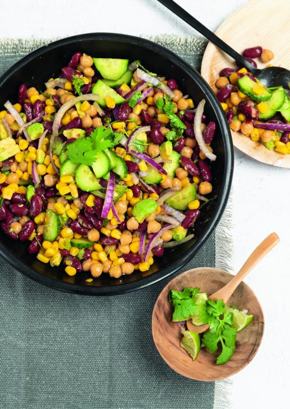 - Mélangez les pois chiches, les haricots rouges et le maïs dans un saladier.